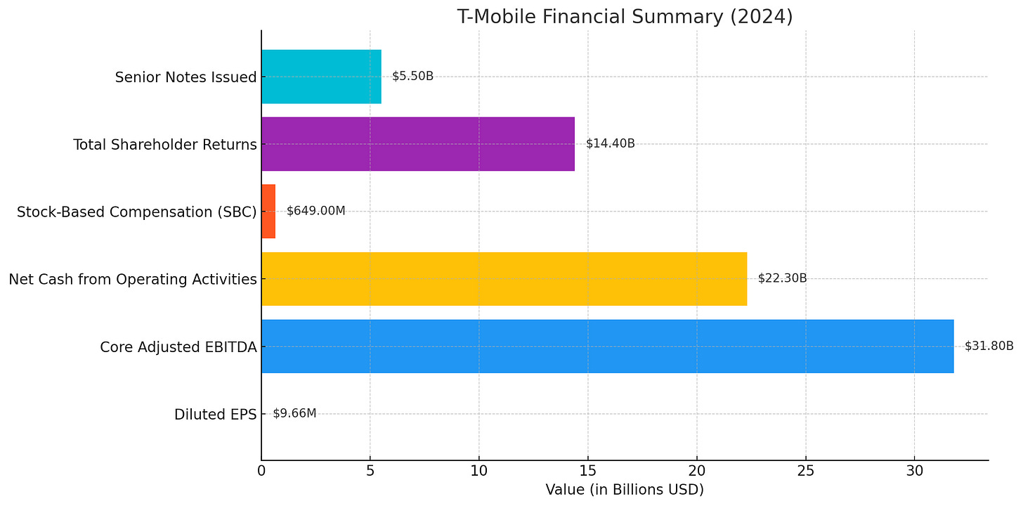 Shareholder Returns: In 2024, T-Mobile returned $14.4 billion to shareholders, comprising $11.1 billion in stock repurchases and $3.3 billion in cash dividends.