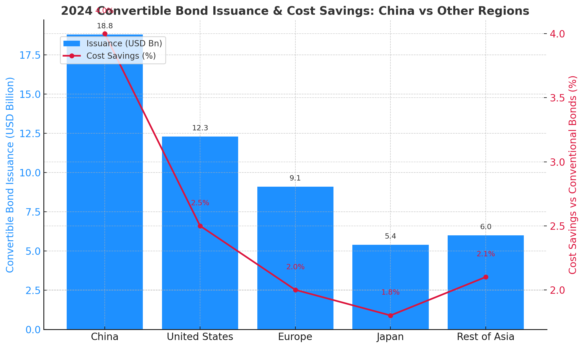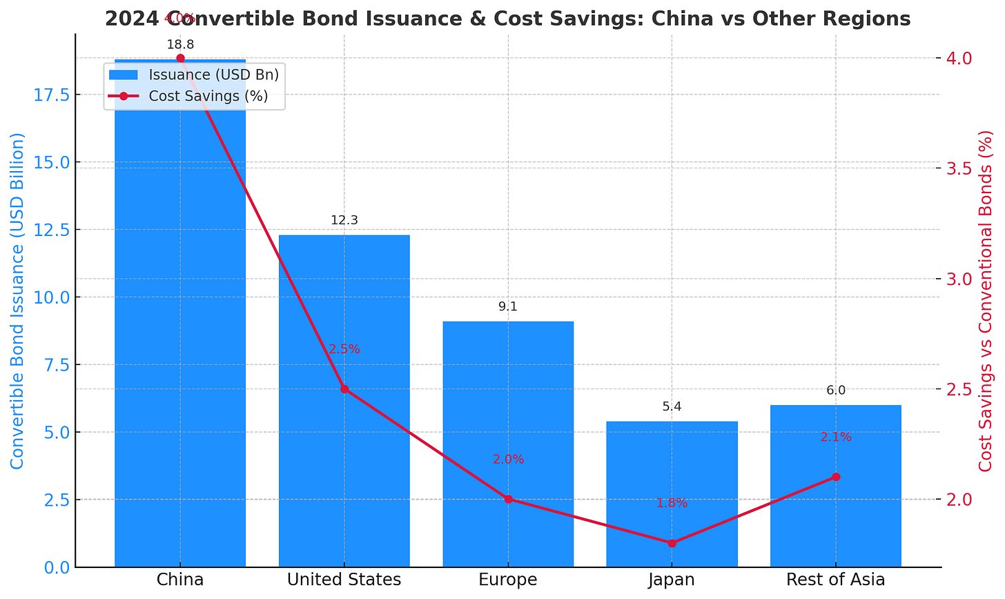 Here is a chart illustrating 2024 convertible bond issuance and cost savings across major regions. It highlights China's leadership in issuance volume and its substantial cost advantage relative to conventional bonds. This dual-axis visualization underscores the strategic financial positioning of Chinese firms versus their global peers.