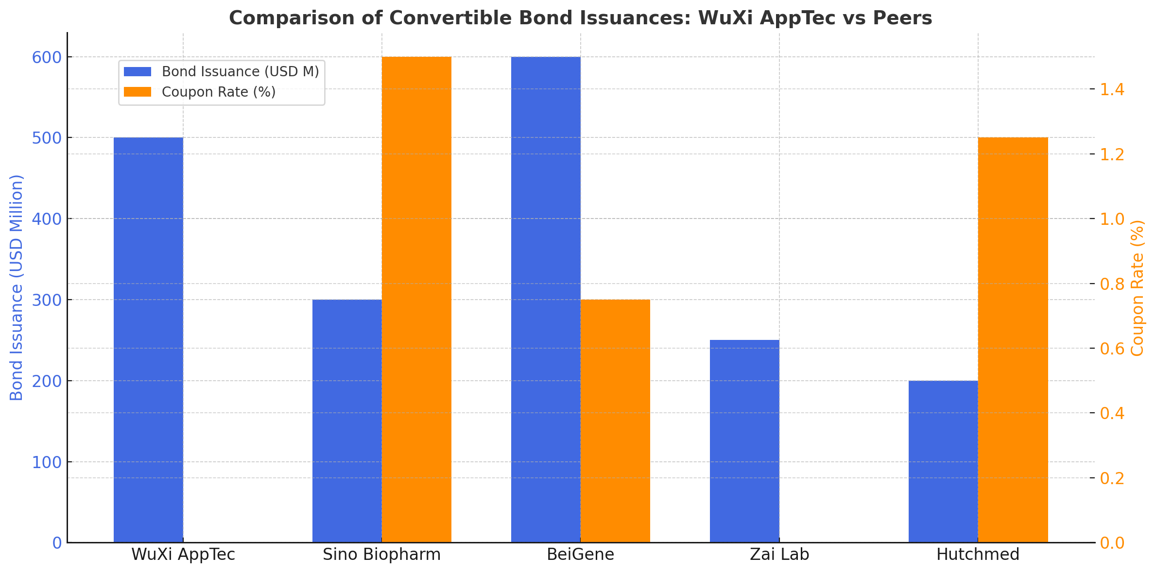A dual-axis comparison chart showing WuXi AppTec's $500 million zero-coupon convertible bond issuance alongside similar-sized pharmaceutical and biotechnology companies. It contrasts issuance amounts and coupon rates, highlighting WuXi AppTec's aggressive financing stance through a high-value, zero-interest structure—amplifying both opportunity and dilution risks relative to its peers.
