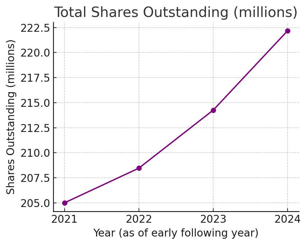 Chart: Total Shares Outstanding (millions). HIMS’s share count expanded from ~205 M in 2021 (post-SPAC) to ~222 M by early 2025 despite share repurchases. Outstanding Class A shares grew by ~8 M from Feb 2023 to Feb 2025, reflecting net dilution from stock-based compensation and other issuances, partially offset by buybacks.