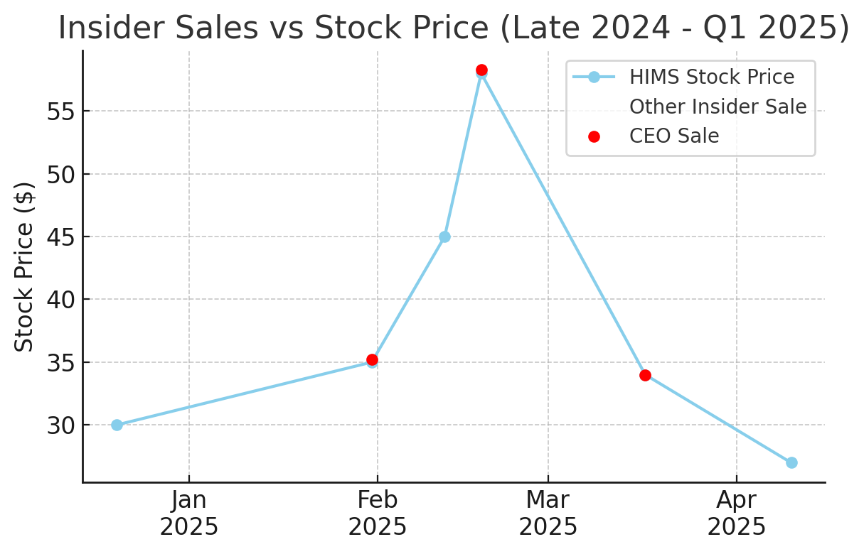 Chart: Insider Sales vs. Stock Price (Late 2024 – Q1 2025). As HIMS stock rocketed ~100%+ from late-2024 into early-2025, insiders unloaded shares aggressively. Red dots mark CEO sales (e.g. ~128k shares at ~$58 in Feb 2025), and orange X’s mark CFO/COO. The stock peaked in mid-February, shortly after which insiders continued selling as the price declined. Such clustered selling can be a red flag, though sales may be pre-scheduled.