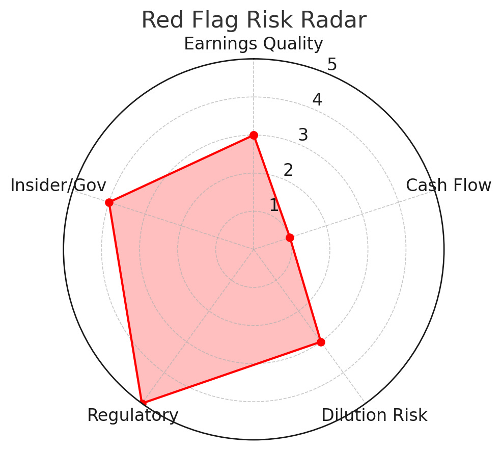 Visual: Red Flag Risk Radar – Forensic Risk Assessment. Interpretation: Regulatory risk is highest (5/5) given looming FDA constraints on compounding and telehealth rule uncertainties. Insider/Governance risk is elevated (4/5) due to significant insider selling and dual-class control structure. Dilution risk is moderate (3/5); dilution exists but is partly mitigated by buybacks and strong cash flow (hence not as high as many growth peers). Earnings Quality is moderate (3/5) – current profits are real but aided by one-offs and heavy adjustments (we’d like to see sustained GAAP earnings without relying on add-backs). Cash Flow risk is low (1/5) – HIMS’s cash generation and balance sheet are strong, reducing financial distress concerns.*