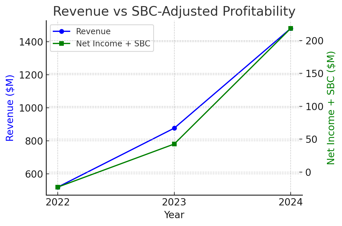 Chart: Revenue vs. SBC-Adjusted Profitability (2022–2024). Revenue surged ~69% in 2024 to ~$1.5 B, while GAAP net income (green line, with SBC added back) climbed to ~$218 M (including a $61.6 M tax benefit) after prior-year losses. This illustrates improving operating leverage, although ~42% of 2024 profit was from a one-time tax gain and excluding $92 M of stock-based comp expense.