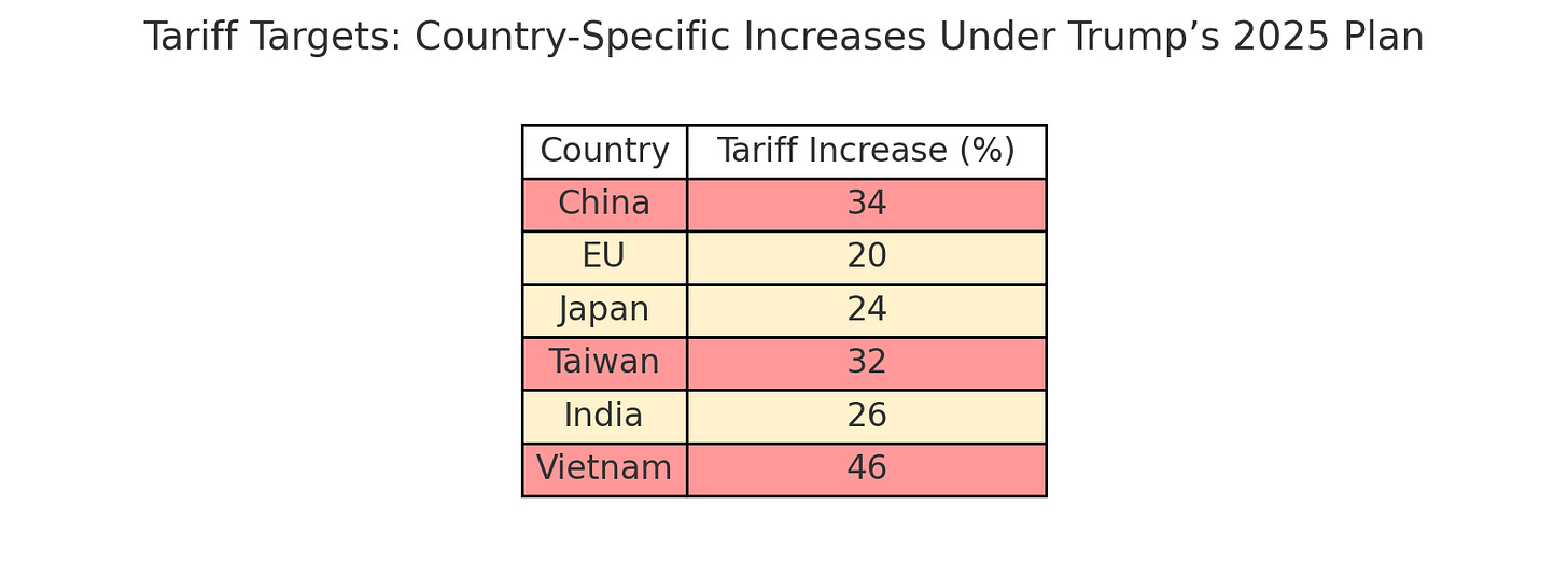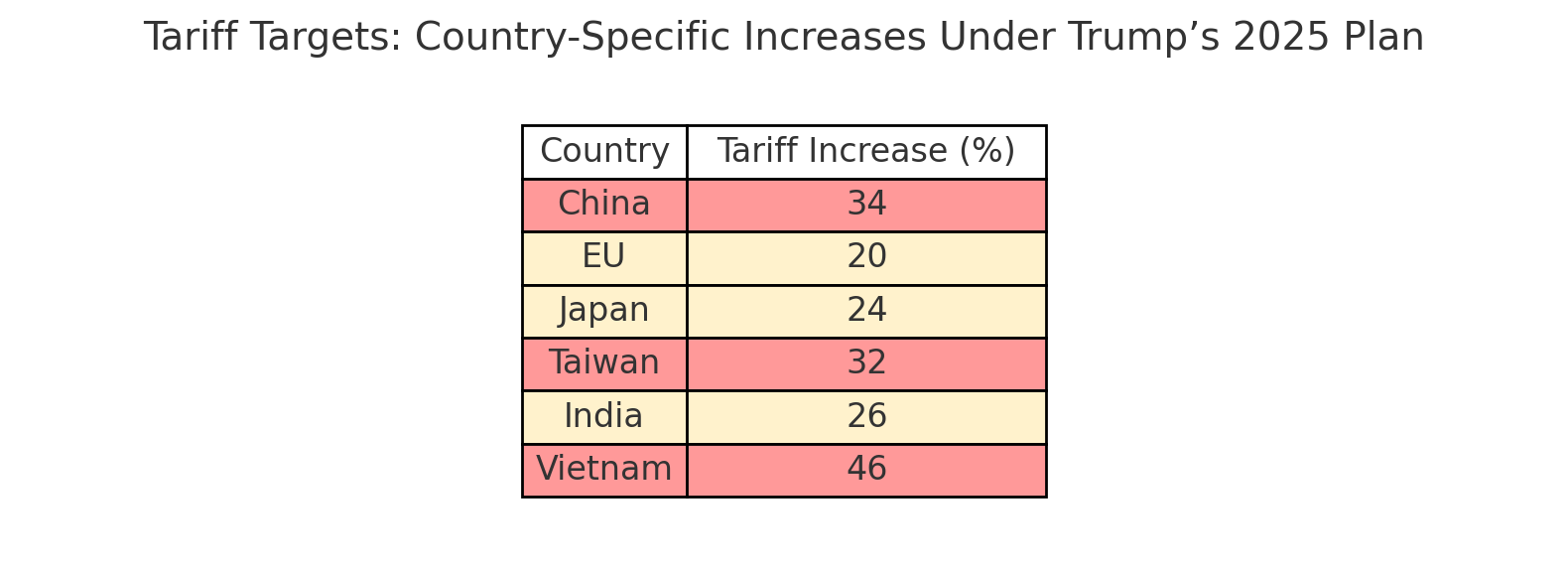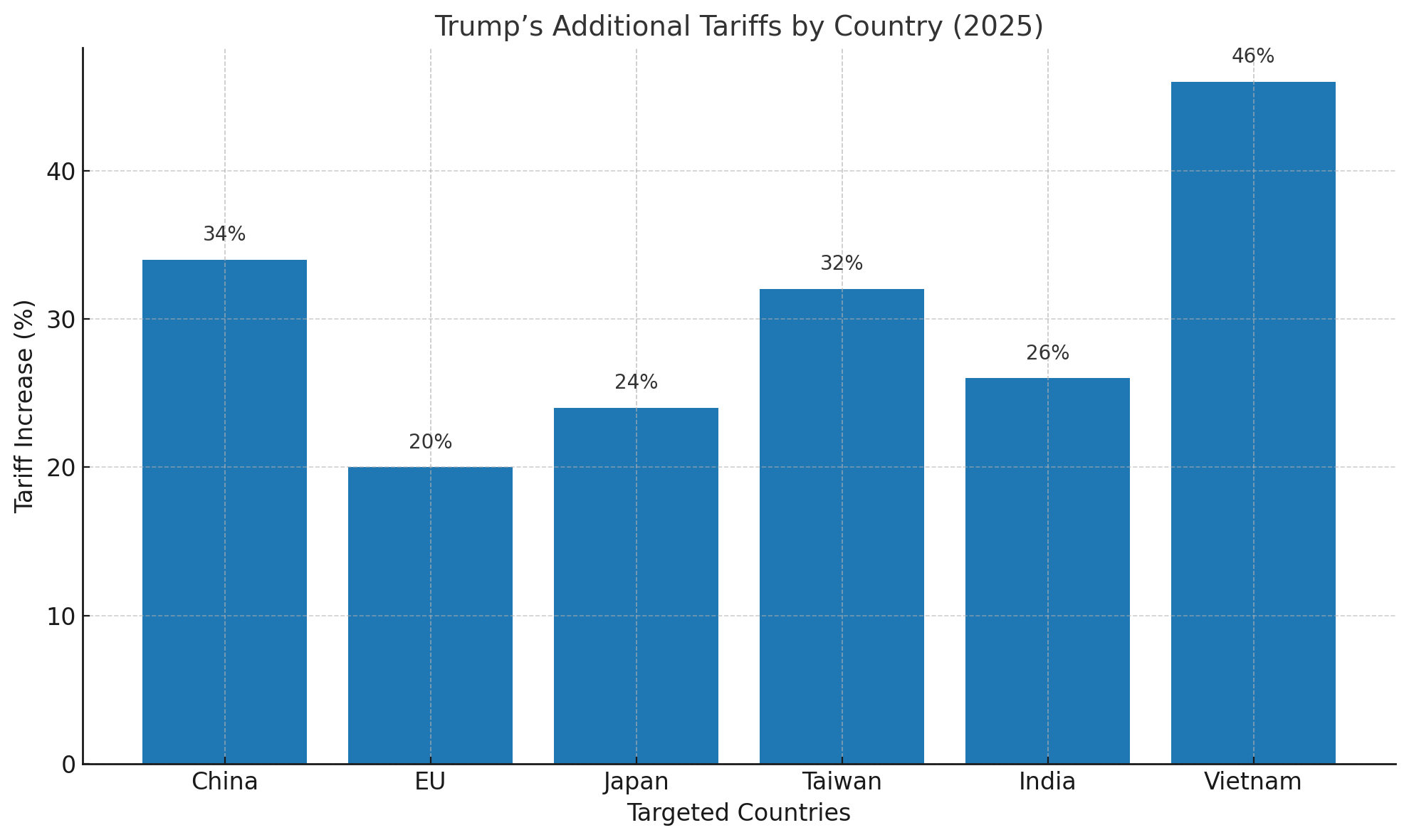 China: An additional 34% tariff, cumulatively resulting in a 54% tariff when combined with existing levies.